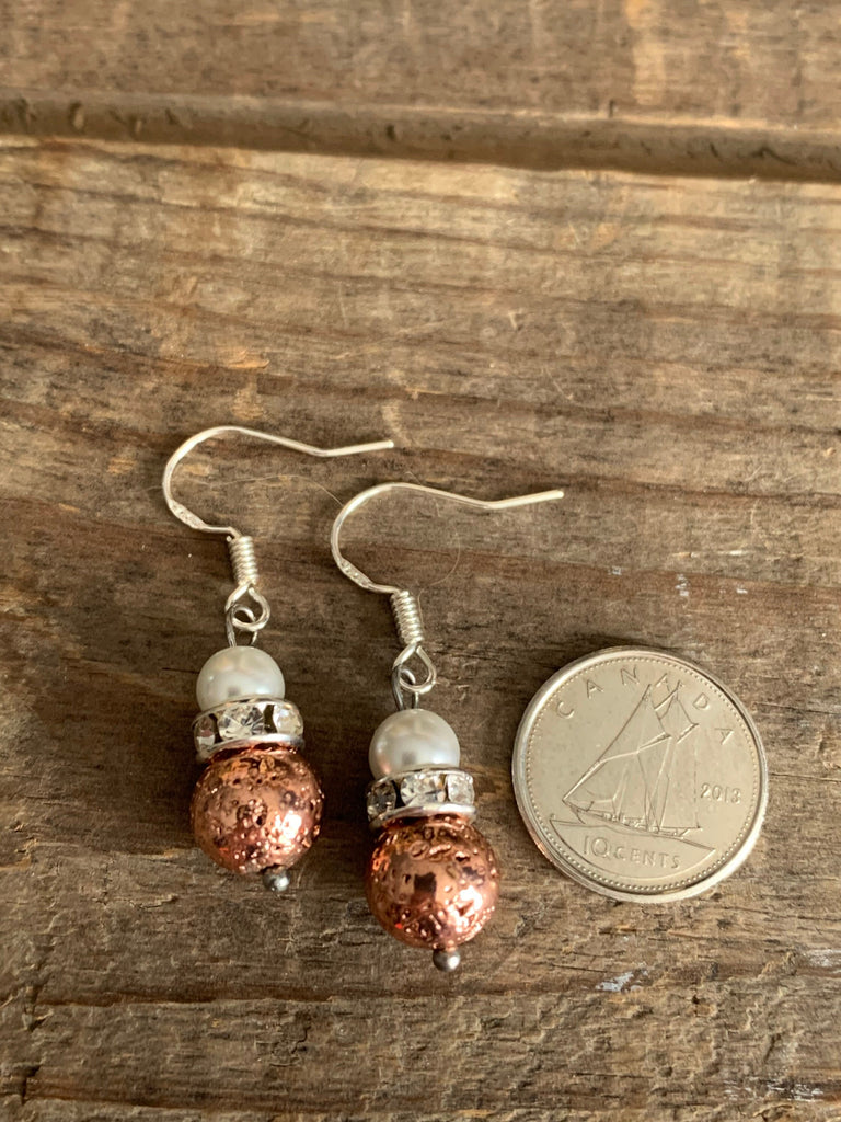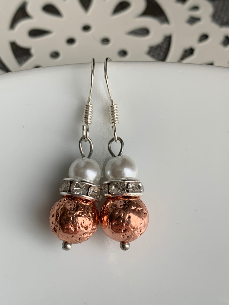 Boucles d’oreilles billes de pierre de lave rose gold et perle blanche chic bijoux diffuseur