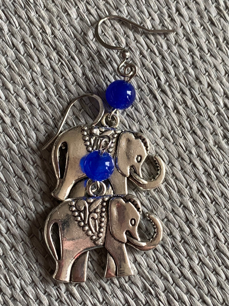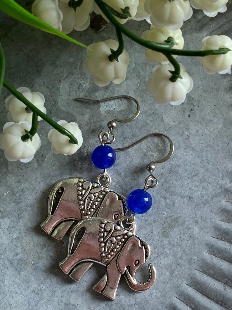 Boucles d’oreilles breloque éléphant argent et billes de verre bleue sur crochet alliage de métaux argent
