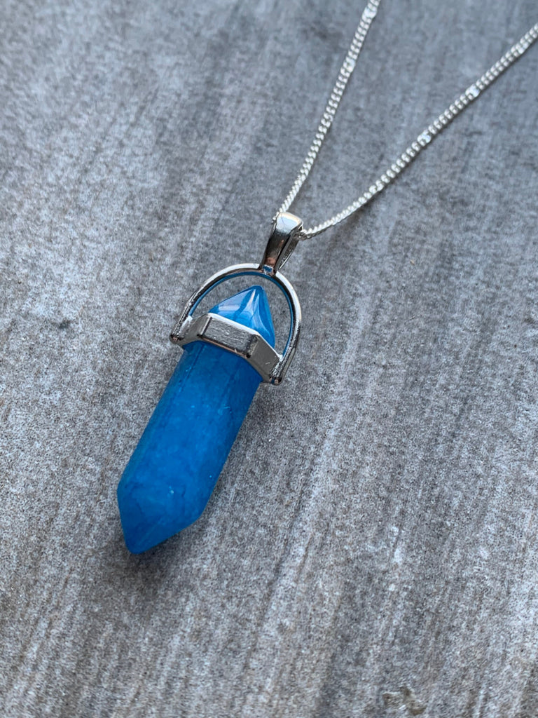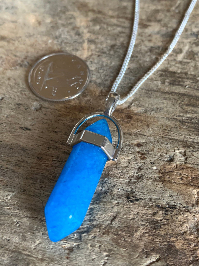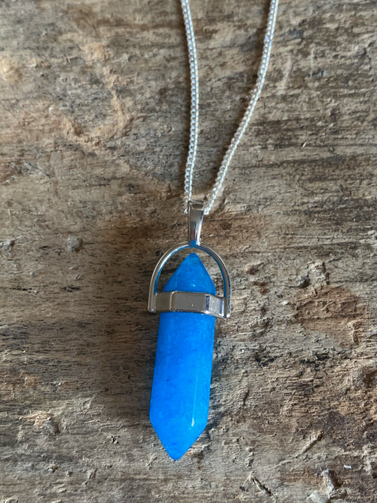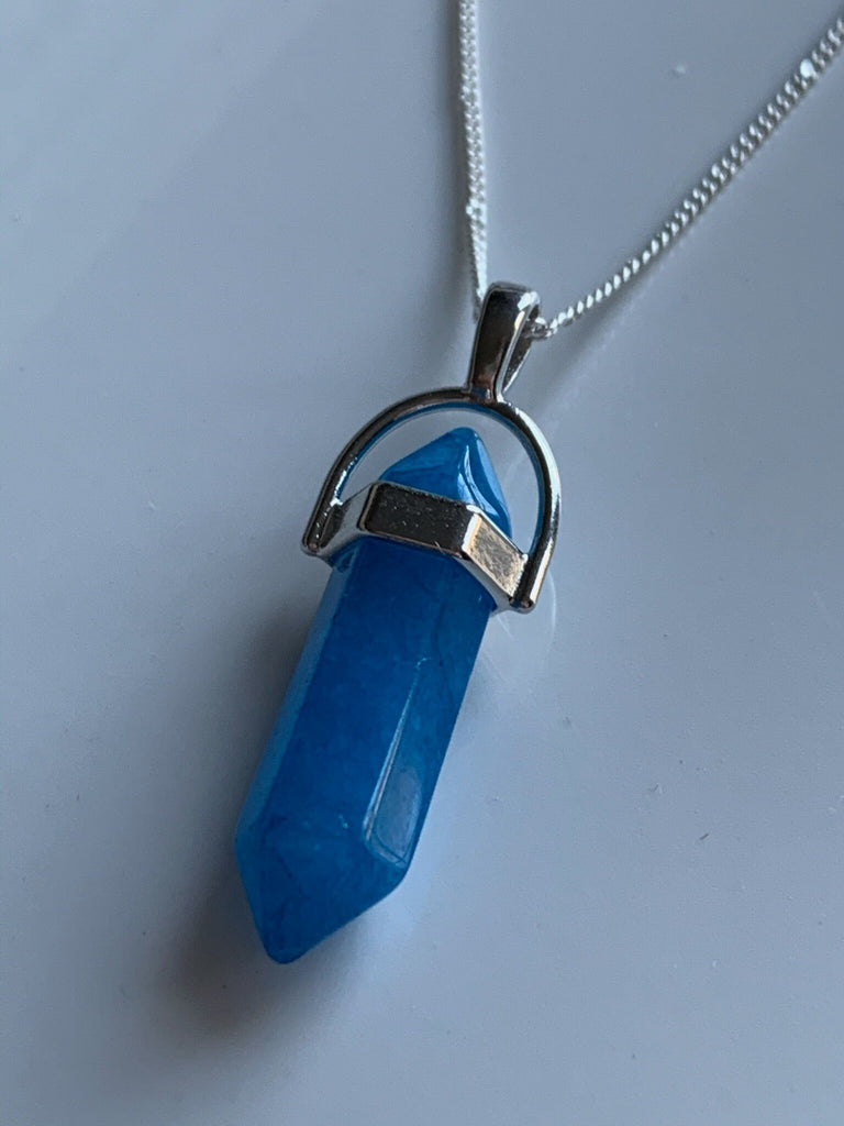Collier alliage de métaux argent et pierre bleue pendule pendulum mystique
