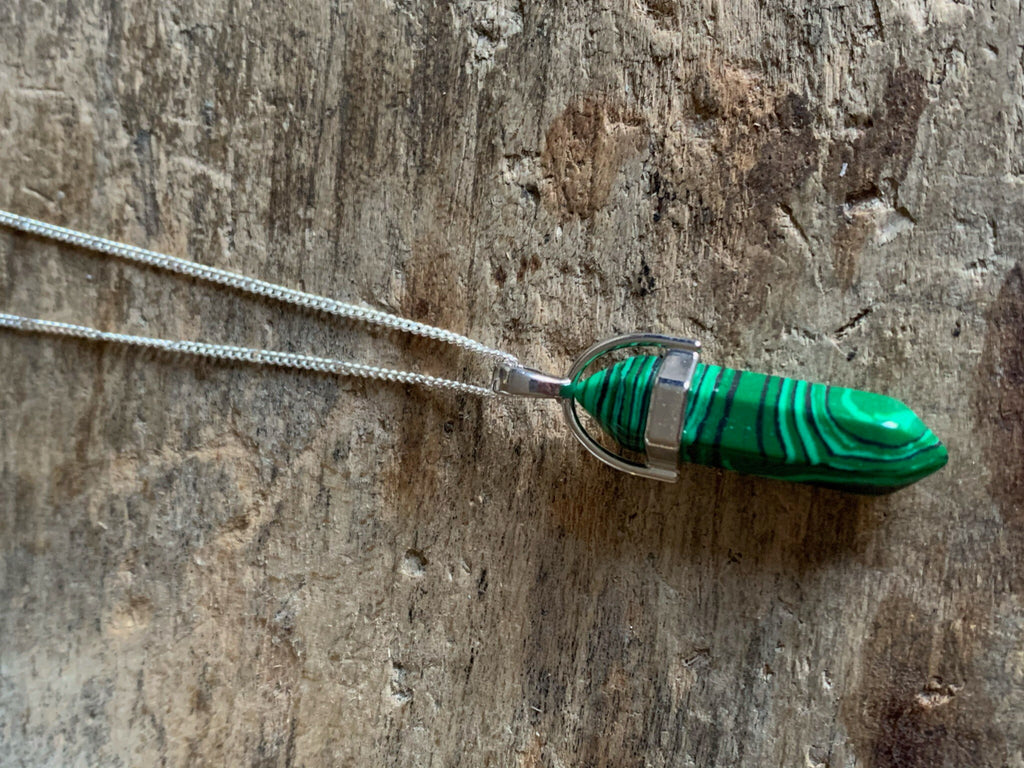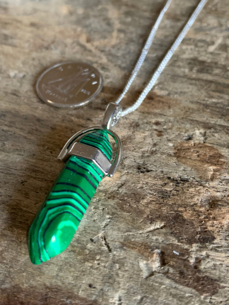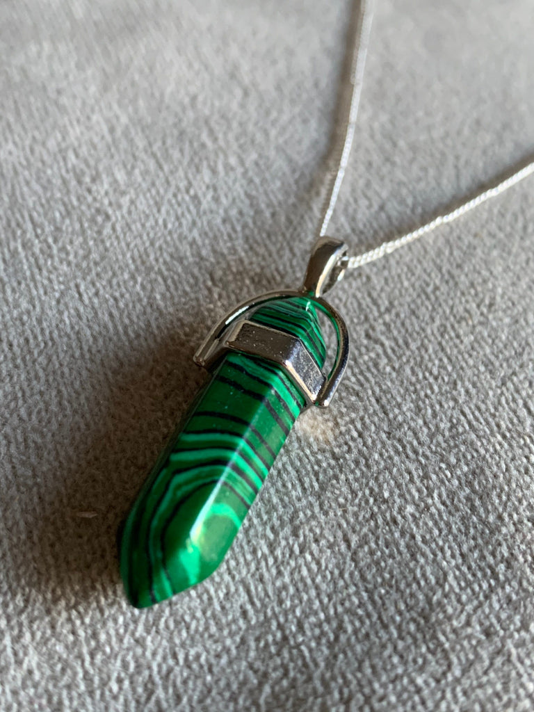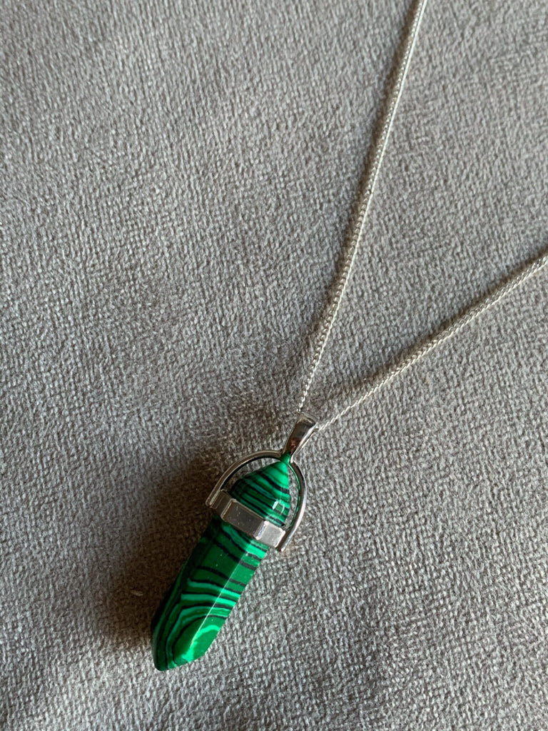 Collier breloque alliage de métaux argent et pierre verte marbrée pendule pendulum mystique