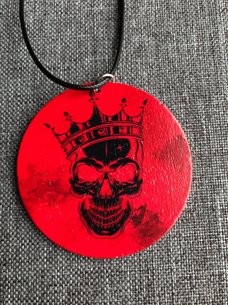 Collier breloque garçon rond bois modèle skull tête de mort tête de squatte noir sur fond rouge