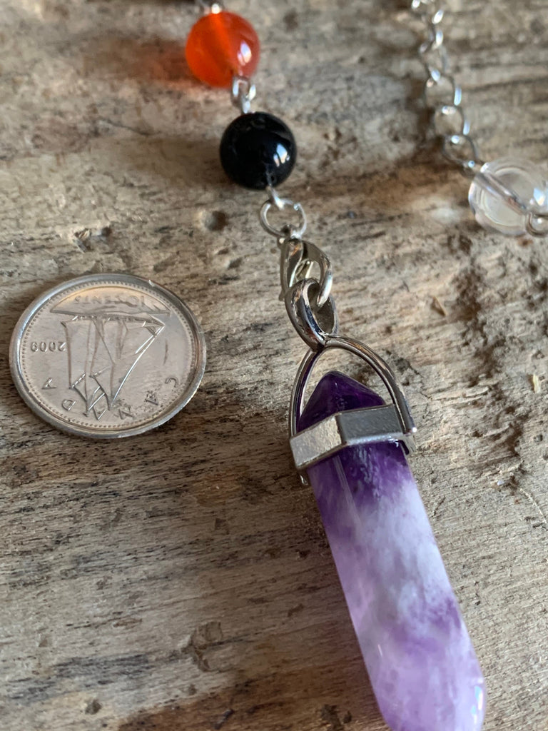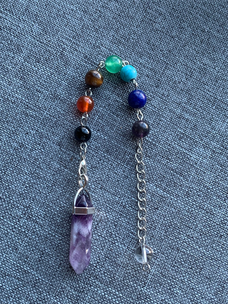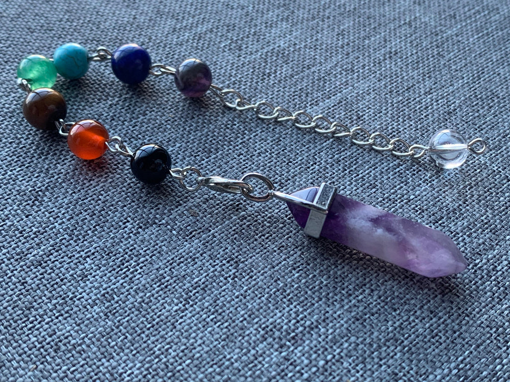 Pendule pierre améthyste mauve sur chaîne alliage de métaux argent et billes de verre chackras arc-en-ciel pendulum mystique