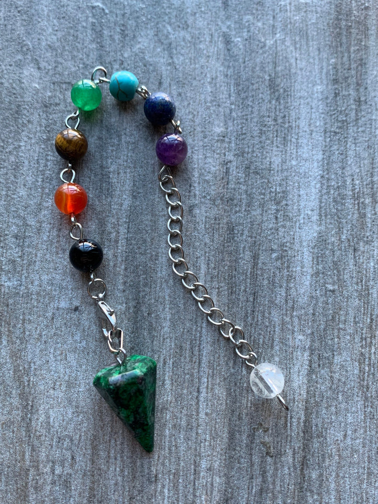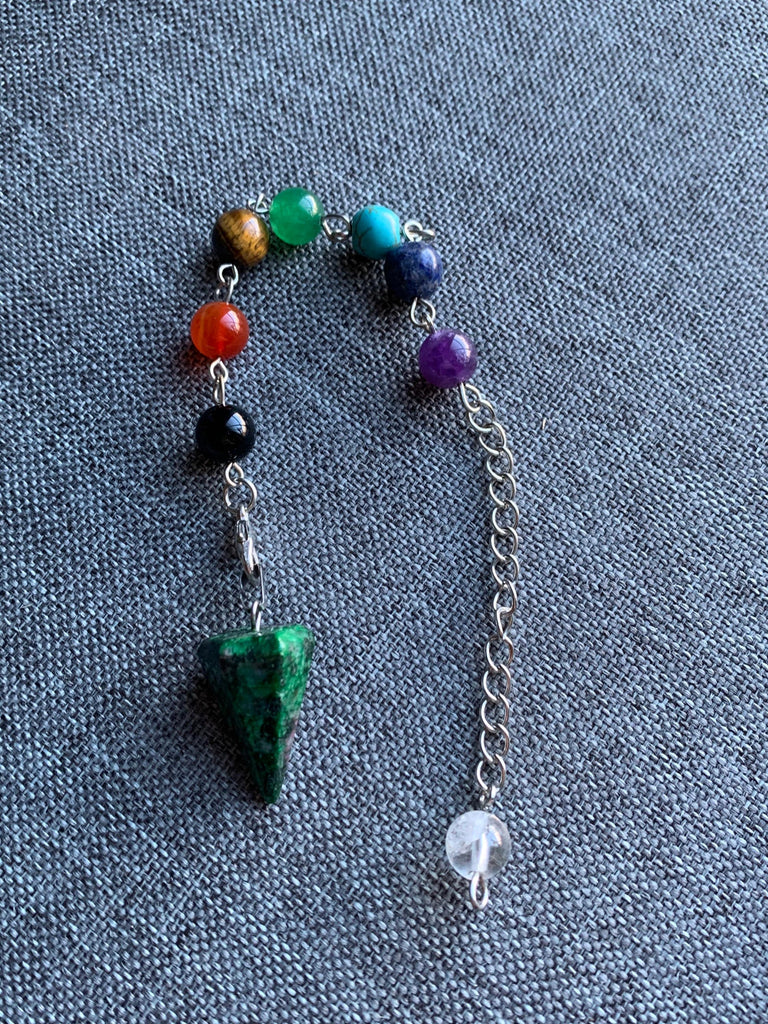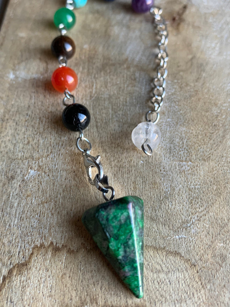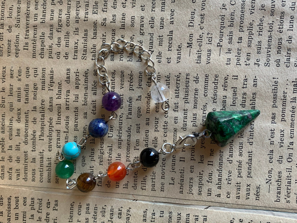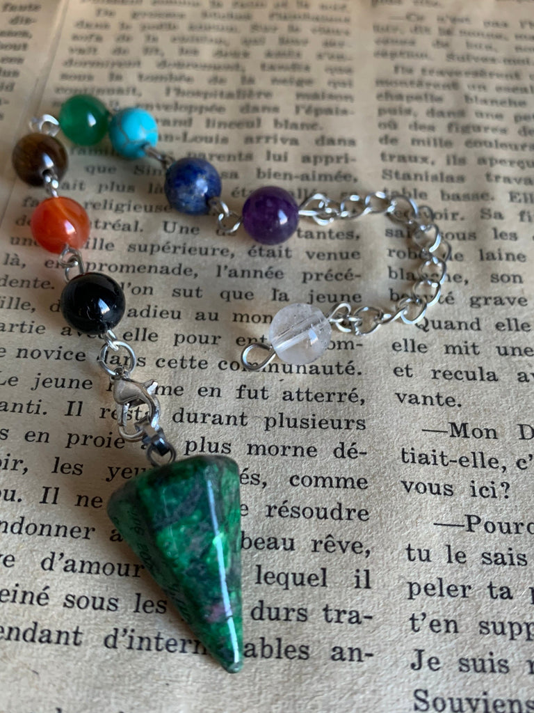 Pendule pierre verte alliage de métaux argent sur chaîne argent et billes de verre chackras arc-en-ciel pendulum mystique