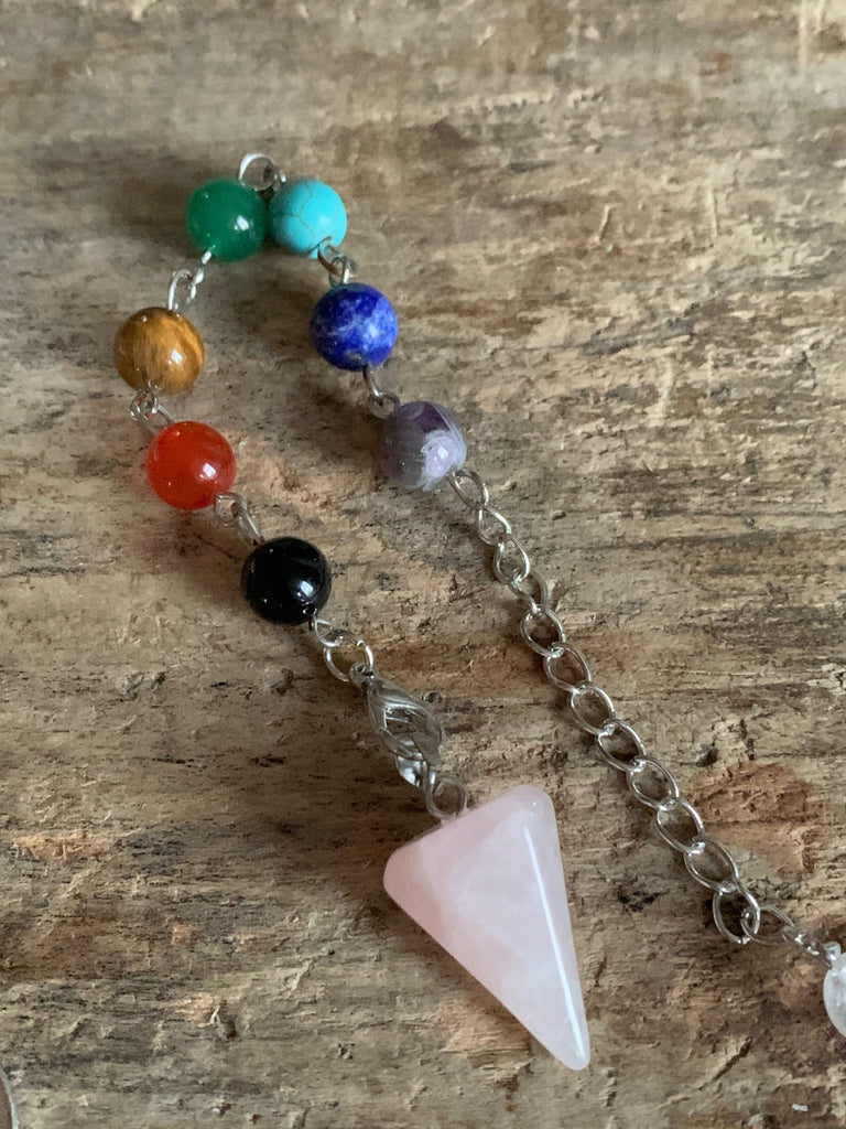pierre de quartz rose et alliage de métaux argent billes de verre chackras arc-en-ciel pendulum mystique